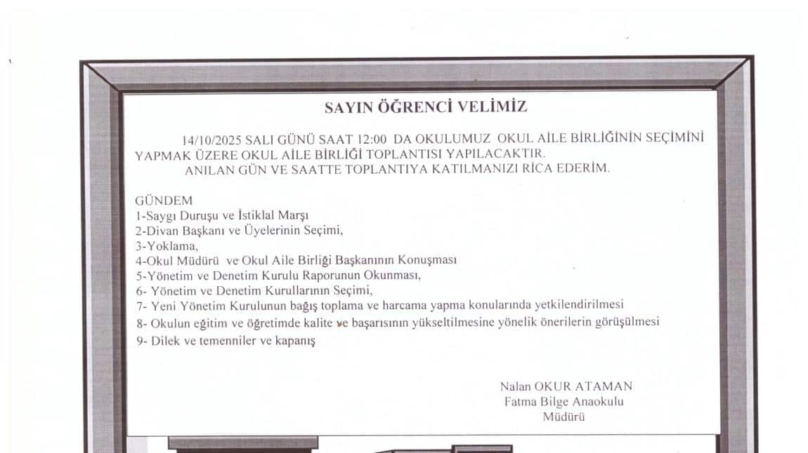 2025/2026 Eğitim Öğretim Dönemi sene başı Okul Aile Birliği Toplantısı 14/10/2025 Salı günü saat 12.00 da okulumuz E Sınav Salonunda yapılacaktır.